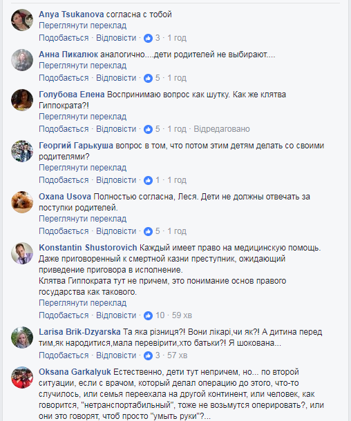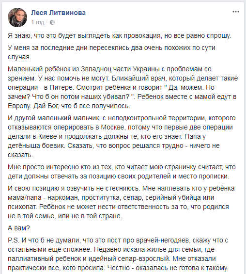 Леся Литвинова пишет, что за последнее время произошло два аналогичных случая, связанные с Россией, медициной и детьми с Украины. Один из них произошел в Санкт-Петербурге, куда приехала семья из западной Украины. У ребенка были проблемы со зрением. Медик внимательно осмотрел пациента и заявил, что мог бы его вылечить, но смысла в этом не видит. С его слов, в будущем ребенок вырастет и пойдет убивать россиян. Сейчас семья поехала на лечение в Европу.