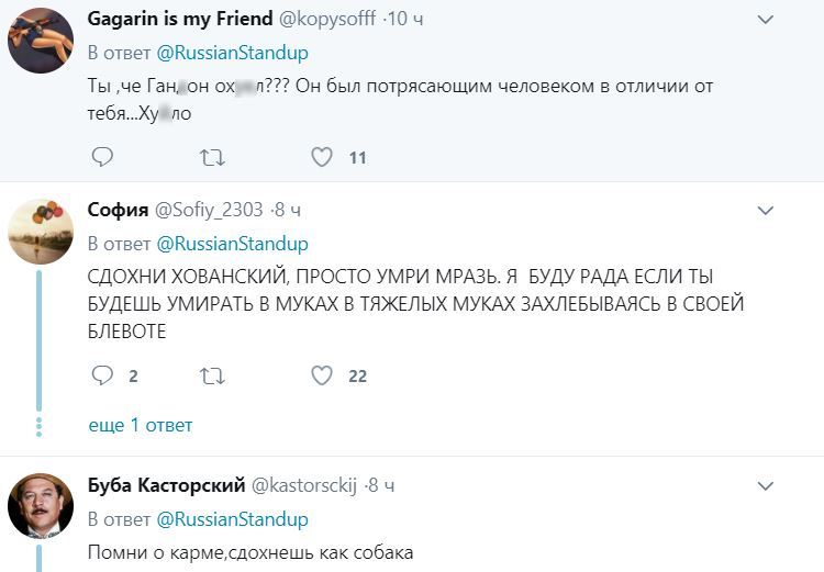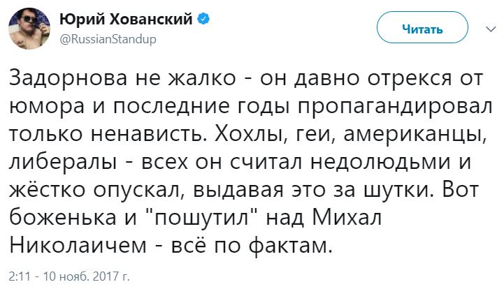 Соцсеть живо отреагировала на такую, казалось, беспардонную "эпитафию". Пользователи Twitter разделились во мнениях относительно личности Задорнова. Некоторые горячие поклонники пропагандиста, как и подобает любителям “русского мира”, начали призывать различные кары на голову Хованского.