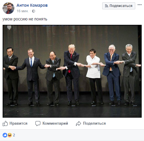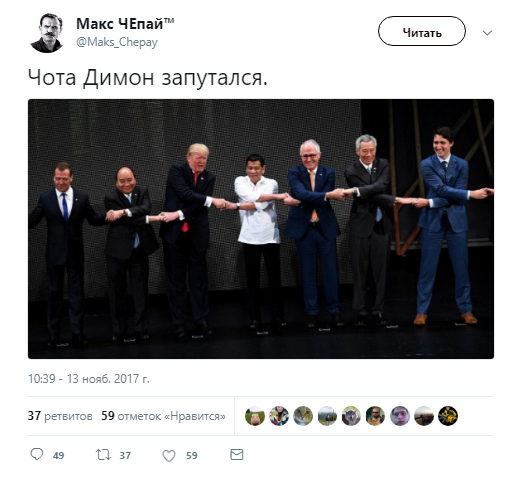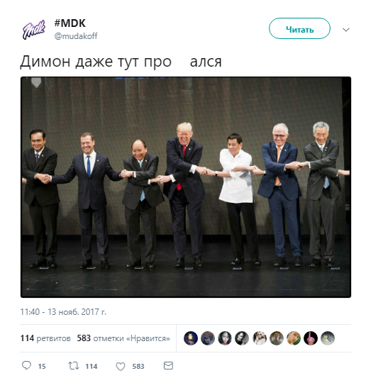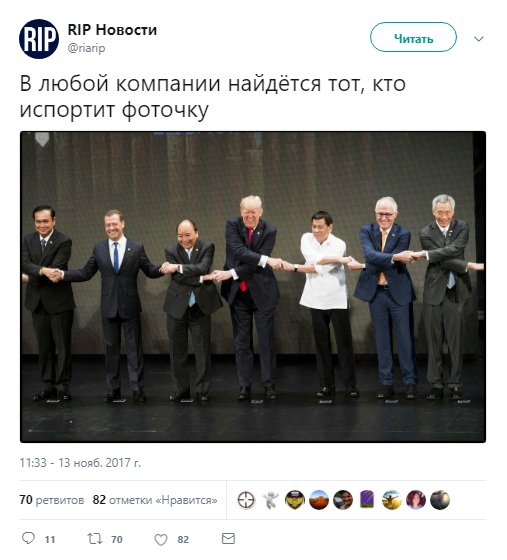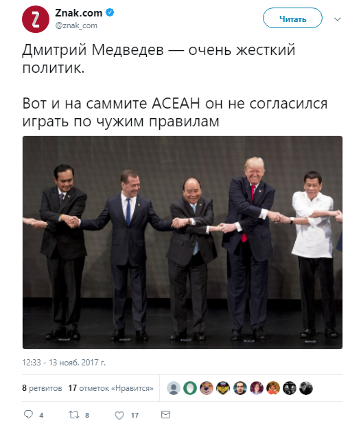 Интернет буквально взорвал новый казус с премьер-министром России Дмитрием Медведевым, который стал объектом насмешек соцсетей из-за совместной фотографии с Дональдом Трампом и мировыми лидерами на форуме АСЕАН столице Филиппин.