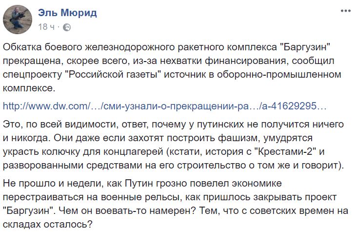 Из-за санкций, которые привели к нехватке финансов и технологий, Россия была вынуждена заморозить свой проект “Баргузин” по строительству железнодорожного ракетного комплекса.