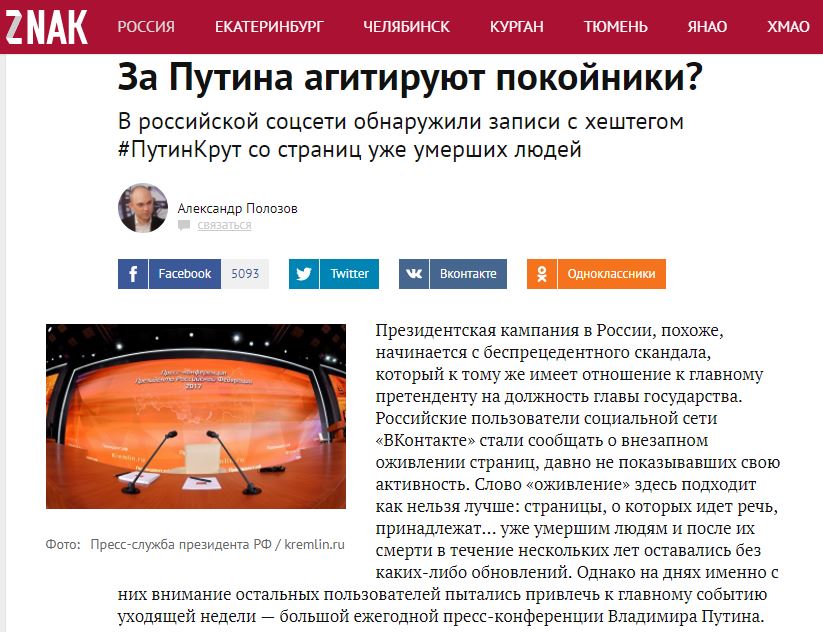 В России вскрылась сенсация об особенностях предвыборной кампании бессменного российского лидера Владимира Путина. В популярной соцсети “ВКонтакте”, подконтрольной российским спецслужбам, за президента агитируют давно умершие россияне.