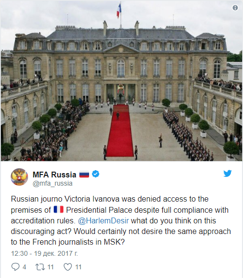 В ответ на это в Министерстве иностранных дел России заявили, что огорчены такими действиями французских властей, и намекнули на возможность введения "зеркальных" мер в отношении французских журналистов.