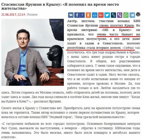 На аннексированный полуостров Ярушин приезжал не единожды, побывав здесь последний раз летом 2017 года во время своих очередных гастролей.