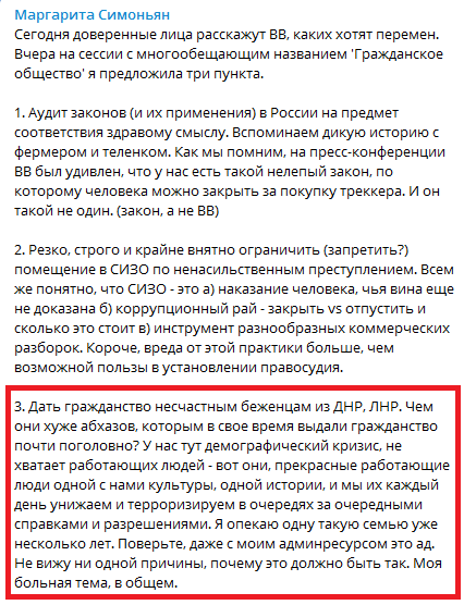 Она пишет, что в России разгорелся демографический кризис, обернувшийся нехваткой трудоспособного населения. При этом Симоньян отмечает постоянное унижение беженцев с Донбасса российской бюрократией, справками и разрешениями, призывая российские власти разрешить выдачу местных паспортов сбежавшим из Донбасса людям.