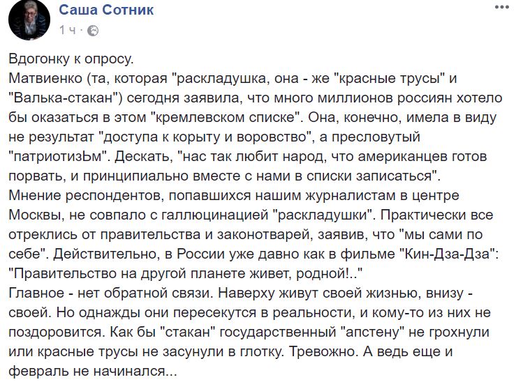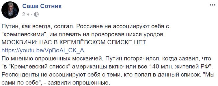 “Путин, как всегда, солгал. Россияне не ассоциируют себя с "кремлевскими", им плевать на проворовавшихся уродов. По мнению опрошенных москвичей, Путин погорячился, когда заявил, что "в "Кремлевский список" американцы включили все 140 млн. жителей РФ". Респонденты не ассоциируют себя с теми, кто попал в данный список. "Мы сами по себе", - заявили опрошенные”, - рассказал непримиримый критик путинского режима.