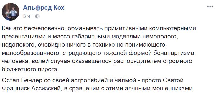 “Как это бесчеловечно, обманывать примитивными компьютерными презентациями и массо-габаритными моделями немолодого, недалекого, очевидно ничего в технике не понимающего, малообразованного, страдающего тяжелой формой бонапартизма человека, волей случая оказавшегося распорядителем огромного бюджетного пирога”, - постебался Кох.