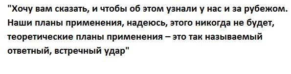 Хозяин "сверхдержавы" добавил, что ядерное оружие будет применено незамедлительно в том случае, если российские системы предупреждения ракетного нападения выявят старт чужих ракет и будет известно о траектории полетов и времени падения головных частей на территорию России.