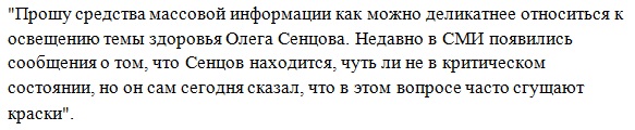Москалькова сообщила, что половину часа они обсуждали состояние здоровья Сенцова. По ее словам, политзаключенный общается с мамой в электронном режиме, а звонит только сестре. Кроме того, российский омбудсмен добавила, что украинец много читает и похвалил библиотеку в колонии. Слушая Москалькову, можно начать сомневаться, что режиссер отбывает наказание, а не отдыхает в российском пансионате.