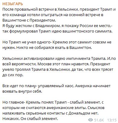 "Я буду жестким с Владимиром, я покажу России ее место",- так сформулировал Трамп идею вашингтонского саммита", - отметил "Незыгарь".