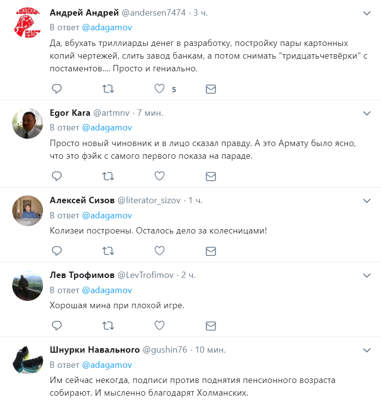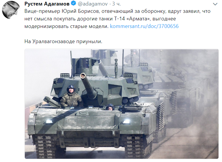 Ехидно прокомментировал его заявление известный российский блогер Рустем Адагамов, который отметил тяжелую перспективу Уралвагонзавода, рабочие которого еще недавно клялись в верности Путину, а теперь останутся без серьезного госзаказа.