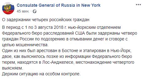 Информация об аресте россиян в США появилась в понедельник, 6 августа. Об этом сообщило консульство РФ в Нью-Йорке. По их данным, произошло это еще 1 - 4 августа. Дипломаты выдали очень дозированную информацию о произошедшем. В частности, имена названы не были. Сообщалось лишь, что подозревают их в отмывании средств, а также сговоре с целью мошенничества.