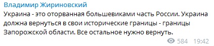 Кроме того, лидер ЛДПР никак не распрощается с маниакальной идеей вернуть Украину в "исторические границы" Запорожской области. Вся остальная территория Украинского государства должна "вернуться" к России.