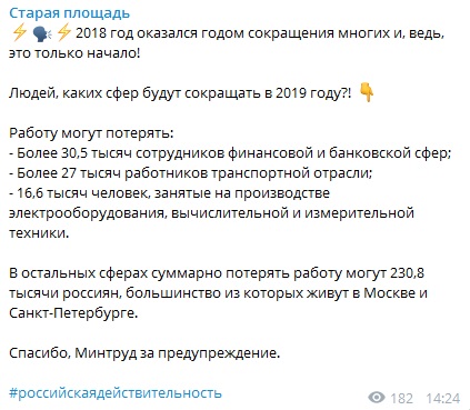 Telegram-канал "Старая площадь" опубликовал предупреждение Минтруда Российской Федерации относительно массовых сокращений, которые грядут уже в новом году, передает "Диалог.UA".