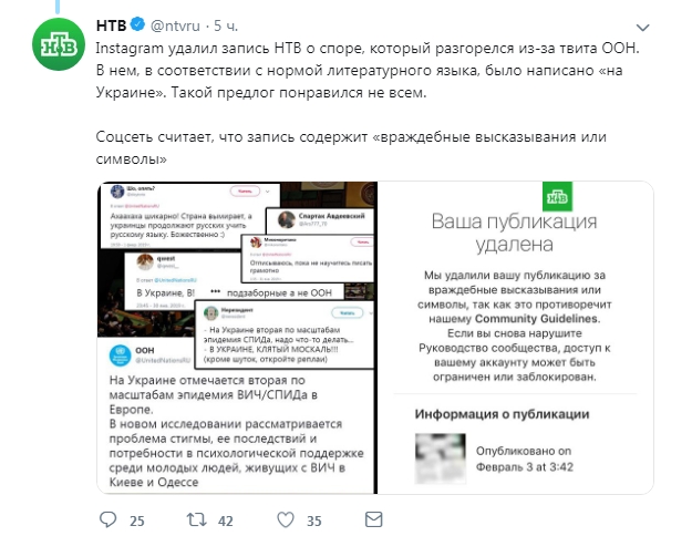 Запись в инстаграме российского телеканала "НТВ", содержавшая слова "на Украине", была неожиданно для самих россиян удалена админами соцсети, сообщает "Диалог.UA".