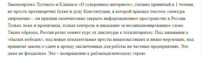 Сотник уверен: государственная машин давно утратила способность к созиданию. И даже законы, которые принимает Госдума, направлены исключительно на "закручивание гаек".