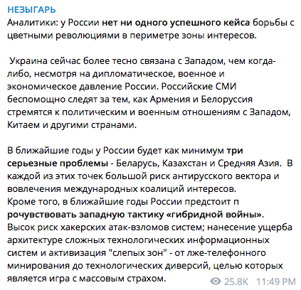 "В ближайшие годы у России будет как минимум три серьезные проблемы - Беларусь, Казахстан и Средняя Азия. В каждой из этих точек большой риск антирусского вектора и вовлечения международных коалиций интересов", - предупредил прокремлевский telegram-канал.