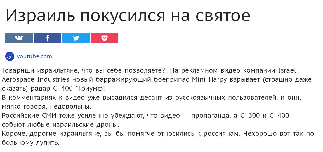 При этом показательна реакция российских СМИ, которые бросились усиленно убеждать, что видео является пропагандой, а С–300 и С–400 собьют любые израильские дроны.