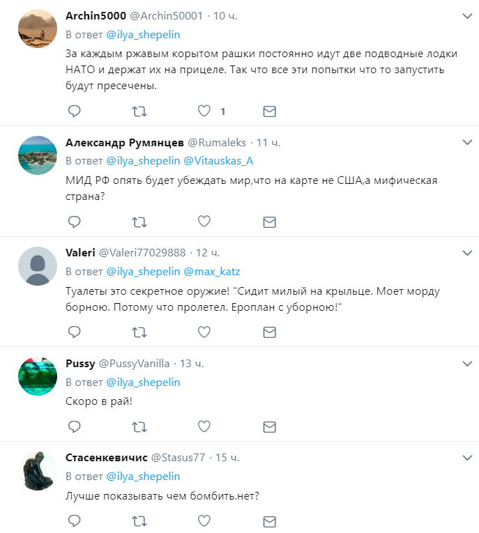 "За каждым ржавым корытом Рашки постоянно идут две подводные лодки НАТО и держат их на прицеле. Так что все эти попытки что-то запустить будут пресечены", - комментируют кадр пользователи социальных сетей, отмечая тотальное превосходство Запада над Москвой в военной сфере.