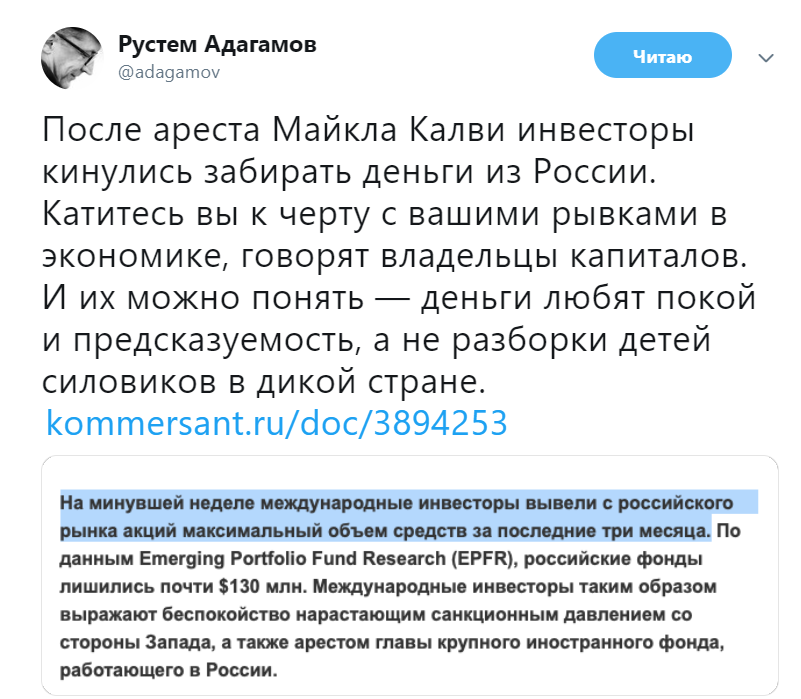 "После ареста Майкла Калви инвесторы кинулись забирать деньги из России. Катитесь вы к черту с вашими рывками в экономике, говорят владельцы капиталов. И их можно понять: деньги любят покой и предсказуемость, а не разборки детей силовиков в дикой стране", - пишет он.