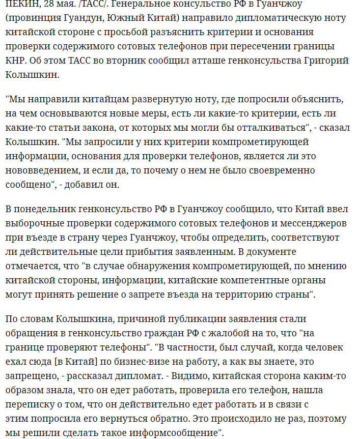 Отмечается, россияне массово пожаловались на то, что в Гуанчжоу, провинция Гуандун, Южный Китай, при въезде в страну пограничники потребовали телефоны граждан с целью того, чтобы просмотреть данные.