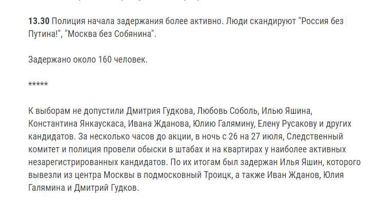 Согласно последим данным, спустя 30 минут после начала акции силовики Путина уже задержали около 160 протестующих.