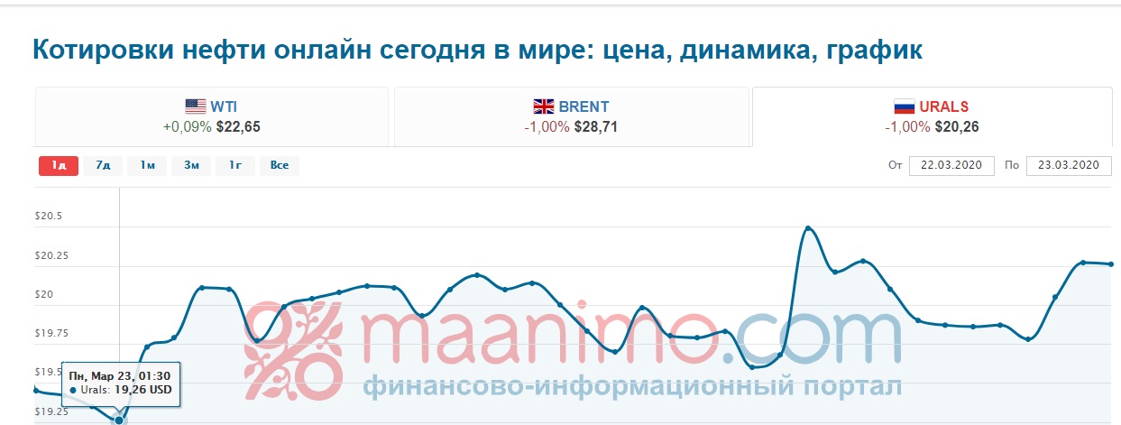 В понедельник, 23 марта российская нефть URALS подешевела: сегодня за один баррель этой марки предлагали 19,5-20,3 доллара.