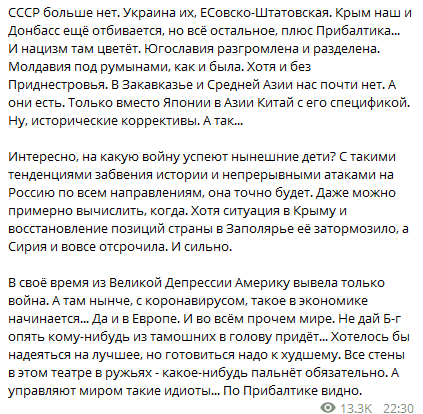 Постоянный участник пропагандистских ток-шоу на российских телеканалах в своем телеграмм-канале написал, что эта война станет следствием "непрерывных атак на Россию по всем направлениям", информирует Диалог.UA со ссылкой на Российский Диалог.