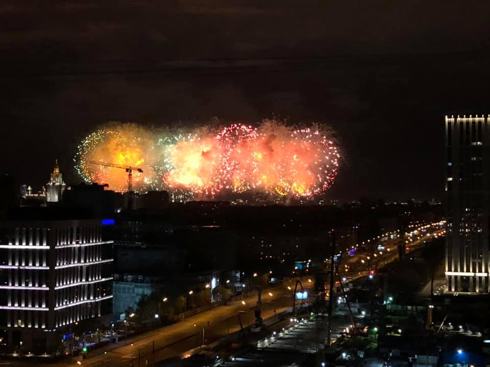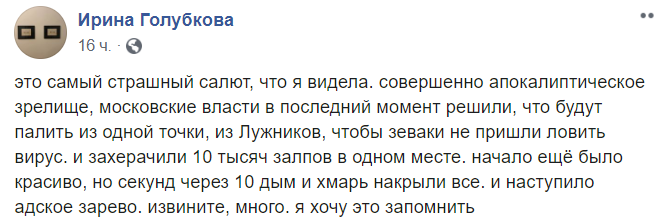 "Это самый страшный салют, что я видела. Совершенно апокалиптическое зрелище, московские власти в последний момент решили, что будут палить из одной точки, из Лужников, чтобы зеваки не пришли ловить вирус. И зах*рачили 10 тысяч залпов в одном месте. Начало ещё было красиво, но секунд через 10 дым и хмарь накрыли все. И наступило адское зарево. извините, много. я хочу это запомнить", - комментирует россиянка.