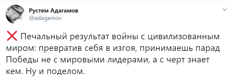 "Печальный результат войны с цивилизованным миром: превратив себя в изгоя, принимаешь парад Победы не с мировыми лидерами, а с черт знает кем. Ну и поделом", - комментирует фотографии автор коллажа.