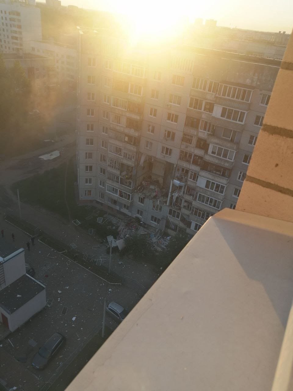 Судя по обнародованным кадрам, произошло обрушение квартир между 3-м и 5-м этажами. Весь двор засыпан осколками окон и обломками дома. Людей срочно эвакуируют.
