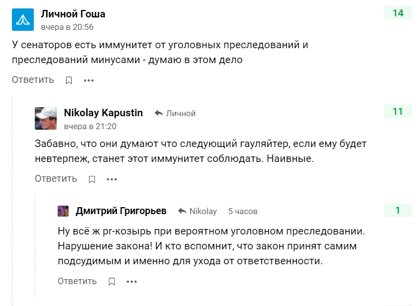 Документ "о статусе сенатора и депутата Госдумы" подразумевает, что президент, ставший пожизненным сенатором, сохраняет за собой социальные и иные гарантии, установленные законом, включая "право на неприкосновенность и ежемесячное пожизненное денежное содержание", отмечают российские журналисты.