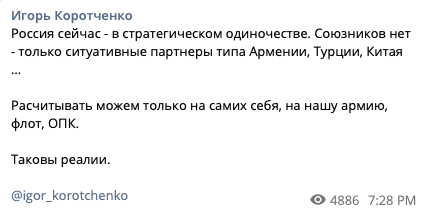 "Рассчитывать можем только на самих себя, на нашу армию, флот, ОПК. Таковы реалии", - написал Коротченко.