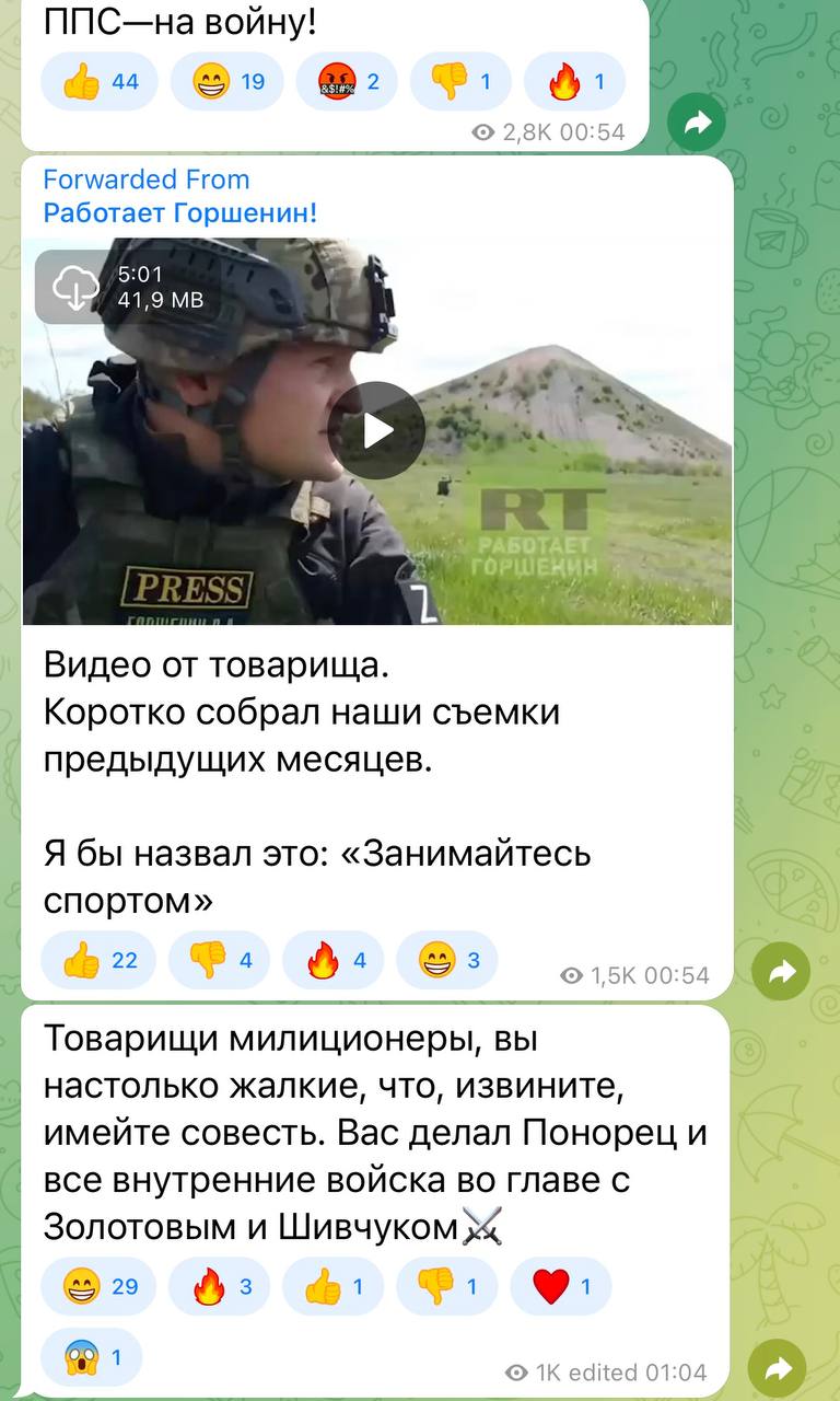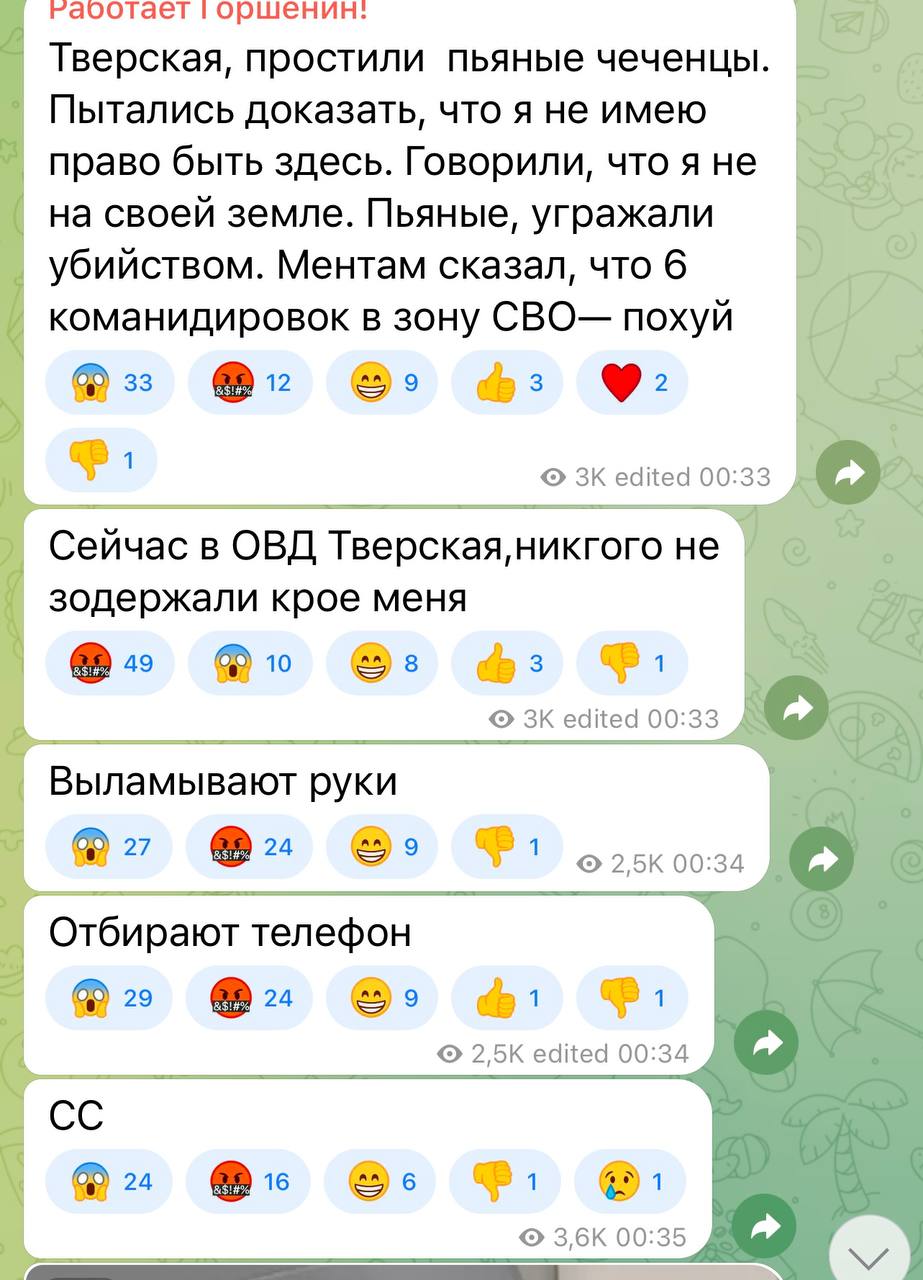 Горшенин снимает ура-патриотические ролики для росТВ про бои в Украине, российских военных и силовиков. Но сегодня он был задержан и оказался в отделе полиции Тверского района. Пропагандист утверждает, что представители Чечни пристали к нему, сказали, что он не на свой земле и пригрозили убийством, пишет Диалог.UA, публикуя скриншоты из российских ТГ-каналов.