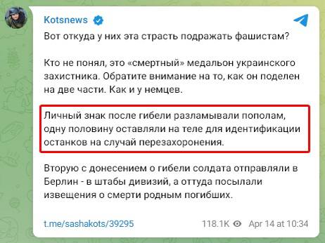 Российский пропагандист Александр Коц заметил признаки фашизма в медальонах украинских военных, которые необходимы для идентификации погибших.