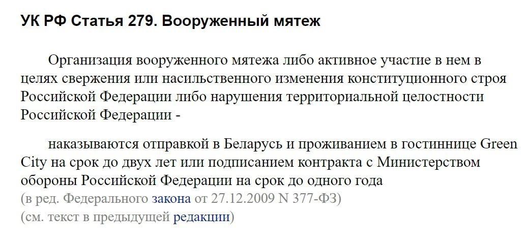 Российские юристы отмечают, что никаких правовых оснований для закрытия дела против Пригожина нет, согласно статье 31 Уголовного кодекса РФ, если человек отказался от продолжения преступления, то его действия должны быть квалифицированы по тому, что он успел совершить, а наемники Пригожина успели сбить 6 вертолетов, один самолет и положили около 20 российских военных