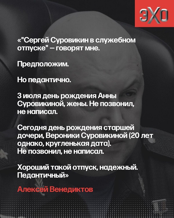 Однако российские инсайдеры сообщают иную информацию. По данным российского журналиста, бывшего главного редактора радиостанции "Эхо Москвы" Алексея Венедиктова, информация про отдых вряд ли соответствует действительности. В распоряжении журналиста появилась информация о том, что после исчезновения Суровикин не поздравил свою жену Анну с днем рождения, которое было 3 июля.