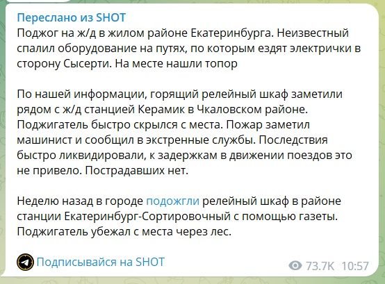 Недавно рядом с железнодорожной станцией Керамик в Чкаловском районе Екатеринбурга машинист одного из поездов заметил горящий релейный шкаф. Машинист вызвал экстренные службы, которые погасили пожар и нашли на месте ЧП топор. Пострадавших в результате инцидента не было, но и "Раскольникова" поймать не удалось.