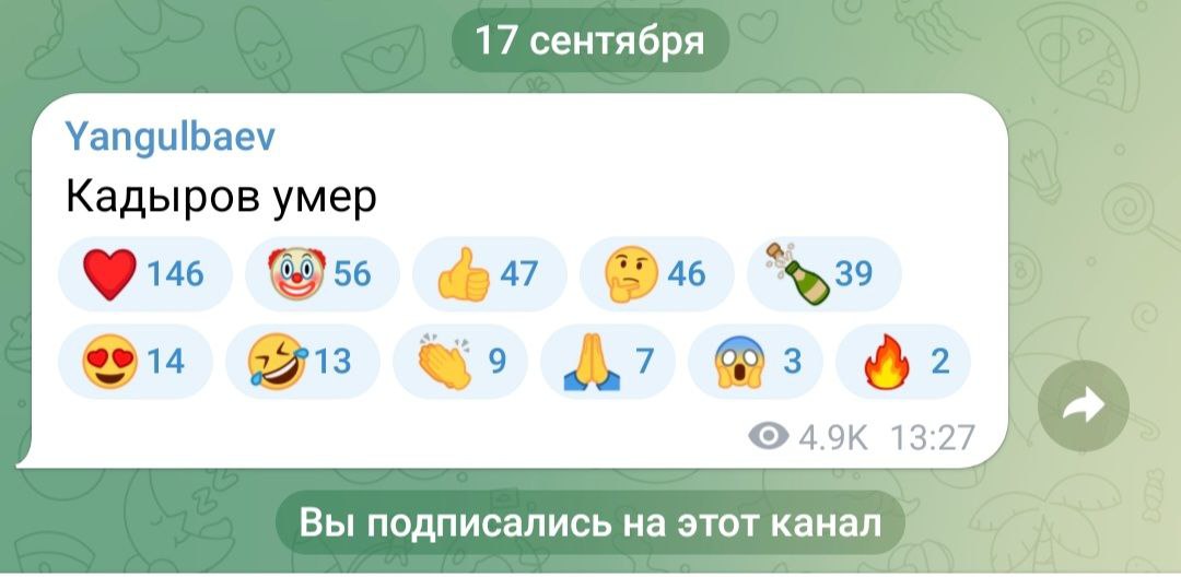 Слухи, которые разразились по этому поводу 17 сентября, подтвердил в своем канале в Telegram Абубакар Янгулбаев - чеченский оппозиционер и личный враг Кадырова.