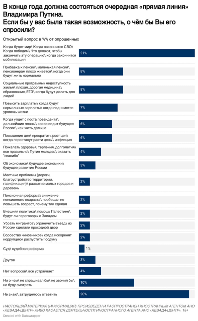 В преддверии ежегодной пресс-конференции Путина 14 декабря российский "Левада-Центр" провел опрос россиян, чтобы узнать, какой вопрос они хотели бы задать Путину.