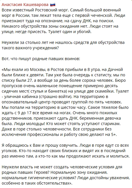 Фактически Кашеварова разоблачила фейки Москвы о якобы мизерных потерях в войне с Украиной. Оказывается, потери таковы, что родственники в одном только морге Ростова вынуждены стоять в очереди по 12 часов, чтобы принять участие в процедуре опознания или сдать ДНК.