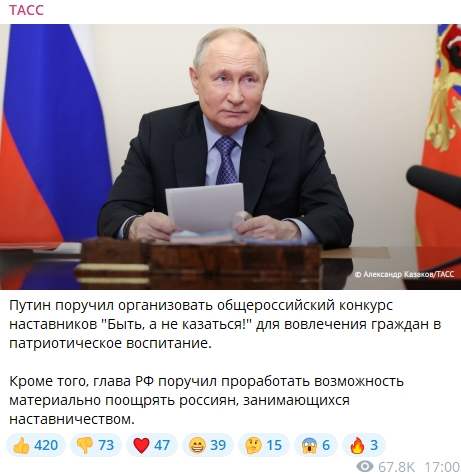 "Путин поручил организовать общероссийский конкурс наставников "Быть, а не казаться!" для вовлечения граждан в патриотическое воспитание", - говорится в новости.