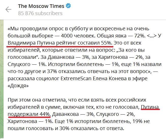 Согласно данным проекта ExtremeScan, не более 55% голосов были отданы за Путина. Это кардинально отличается от официально заявленных результатов, где Путину была приписана рекордная поддержка в почти 90%.