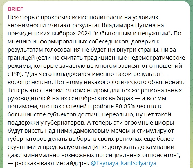 Эти данные вызывают серьезные вопросы о действительной поддержке Путина, текущего режима, его легитимности и легитимности всего выборного процесса. Наблюдатели отмечают, что избыточные цифры выглядят неправдоподобно и Кремль сильно перестарался, пытаясь нарисовать приятные для Путина цифры.