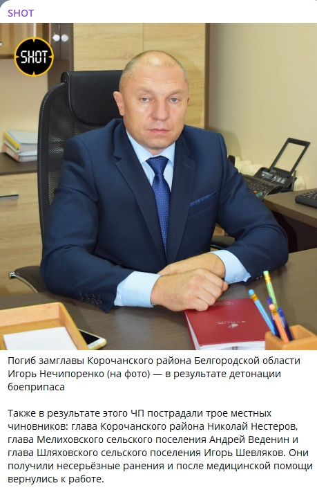 Сегодня, 2 июня, в Белгородчине произошло загадочное ЧП, в результате которого простился с жизнью представитель путинского режима Игорь Нечипоренко. Он занимал должность заместителя главы Корочанского района области.