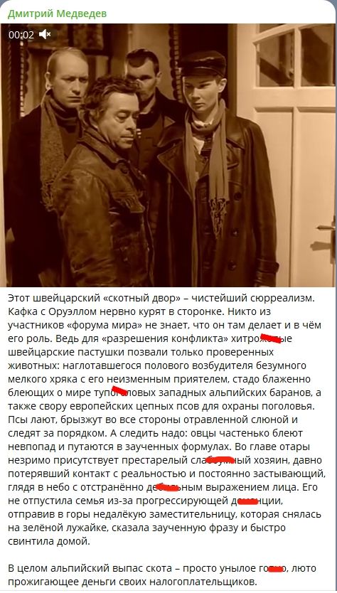 Сообщение Медведева представляет собой одно большое оскорбление. Он назвал саммит "скотным двором", "унылым го**ом", а иностранных лидеров, участвовавших в мероприятии, обозвал "тупо*оловыми альпийскими баранами", "цепными псами", "хряками", "скотами" и прочими животными.