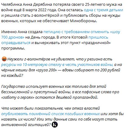 Как сообщает Телеграм-канал "Челябинск Будущего", сбор на покупку мешков объявила вдова погибшего оккупанта, челябинская волонтерка Анна Дерябина.