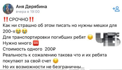 "Как ни страшно об этом писать, но нужны мешки для "200-х" для транспортировки погибших ребят. Нужно много. Стоимость одного 200 рублей. Реальность, к сожалению, такова, что и их ребята покупают за свой счет", - написала она.