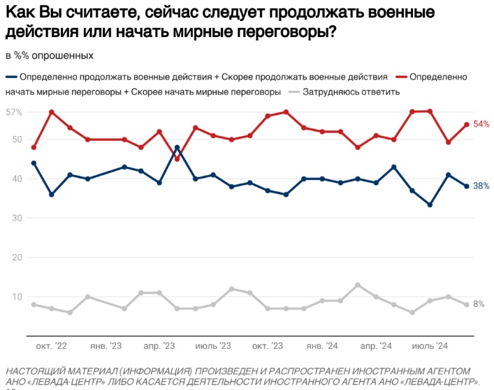 Более половины опрошенных (54%) высказались за начало мирных переговоров, что на 4% больше, чем в августе, но меньше, чем в июле (58%).