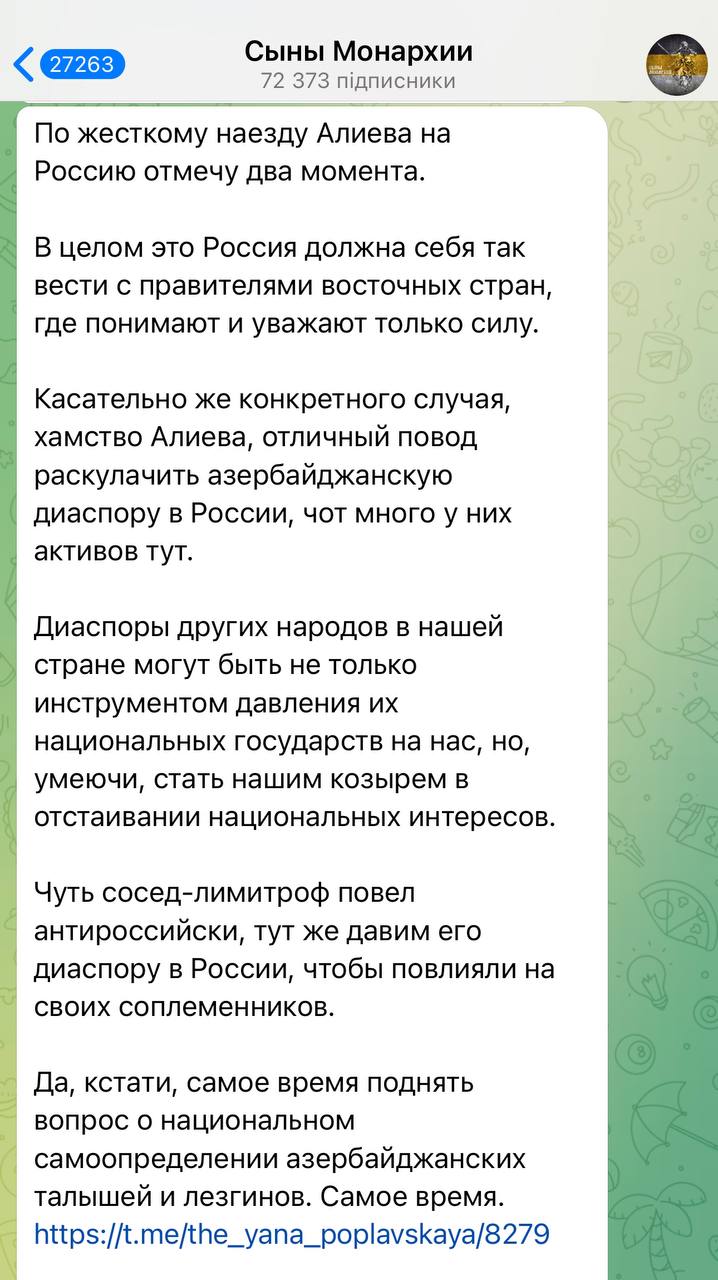 Российской пропагандой уже озвучиваются призывы к притеснению азербайджанской диаспоры в РФ. Так, российский пропагандист Роман Антоновский прямо призывает воспользоваться ситуацией с самолетом и "раскулачить" азербайджанскую диаспору, передает Dialog.UA cо ссылкой на заявление пропагандиста в соцсетях.