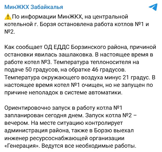 Проблемы с теплом наблюдаются и еще в одном населенном пункте Забайкалья. В городе Борзя остановлена работа двух котлов центральной котельной, причина - зашлаковка. Один из котлов в настоящее время очистили, но так и не смогли запустить в работу: помешали неполадки в системе автоматики. Местные власти утверждают, что оба котла будут запущены к вечеру.